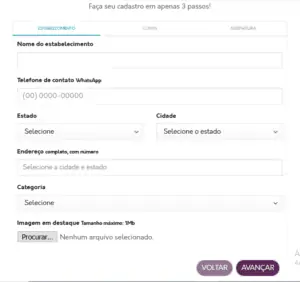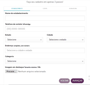 Cadastre os dados do seu estabelecimento, suas redes sociais, endereço e número WhatsApp, escolha seu plano
